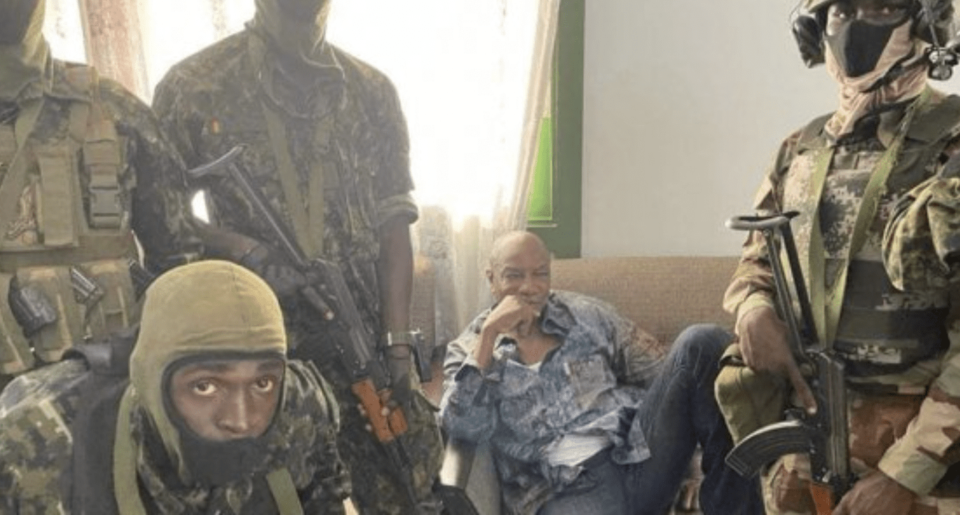 Foto copertina: Alpha Conde, circondato dai soldati delle Forze Speciali che hanno effettuato il suo “arresto”, domenica 5 settembre 2021.