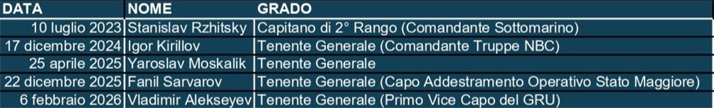 [2] Security Service of Ukraine (2024, 16 dicembre). SSU serves notice of suspicion in absentia to russian general who ordered to use chemical weapons against Ukraine’s Defence Forces. https://ssu.gov.ua/en/novyny/sbu-zaochno-povidomyla-pro-pidozru-rosiiskomu-heneralu-yakyi-nakazav-zastosovuvaty-khimichnu-zbroiu-proty-syl-oborony-ukrainy; Reuters. (2024, December 17). Senior Russian general Igor Kirillov killed by bomb in Moscow, investigators say. Reuters. https://www.reuters.com/world/europe/russian-general-killed-car-bomb-moscow-investigators-say-2025-12-22/